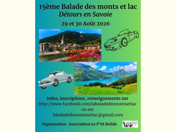 Pour la 15ème édition, l'association le p'tit bolide organise une balade en auto sur les routes de la Savoie. Ouvert à tous véhicules. Balade sur route ouverte avec livre de route. Pour cette quinzième édition, nous organisons cette balade sur 1jours et demi. Le samedi 29 Aout après midi et dimanche 30 Aout toute la journée.