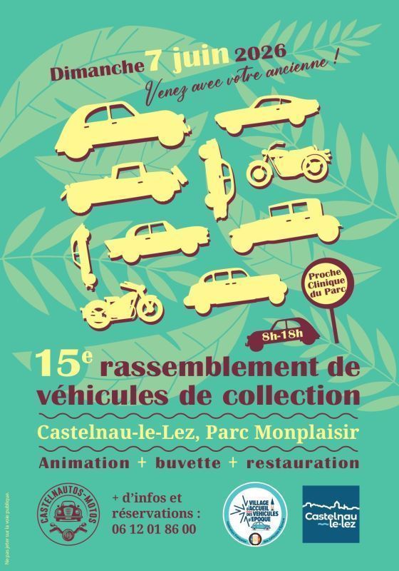 Castelnautos-motos organise son 15ème rassemblement de véhicules de collection le dimanche 7 juin 2026 de 8h à 18h au parc Monplaisir ( à côté de la clinique du parc) à Castelnau le Lez .