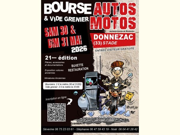 La 21ème Bourse d’échanges autos-motos organisée par l’association Les Vieilles Bielles de Doun’za se tiendra les 30 et 31 mai 2026 au stade municipal de Donnezac (33860), au cœur de la Haute-Gironde.
