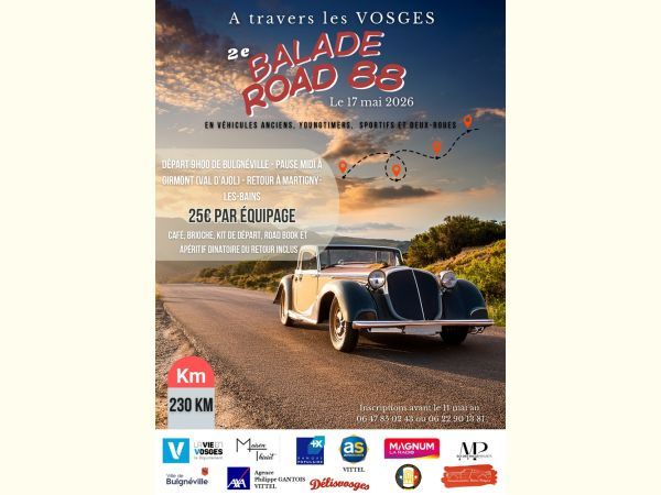 Sortie d'une journée sur les petites route des Vosges et limitrophe, départ de Bulgneville, midi arrivée a Girmont val d'Ajol (repas tirer du sac ou auberge a 800 m) puis départ pour l'après midi et arrivée a Martigny les bains au conservatoire privée des mille projets avec apéritif dinatoire. Ouvert aux véhicules sportif, anciens, youngtimers, 2 ou 3 roues.
