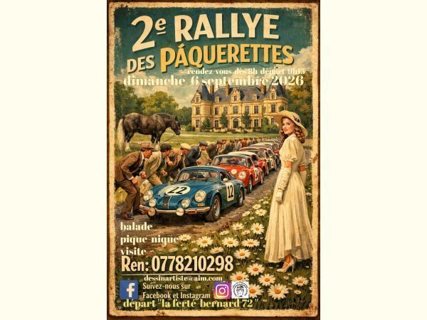 2e rallye des pâquerettes dans la Sarthe le dimanche 6 septembre 2026 départ de La Ferté-Bernard 72 ouvert aux voitures anciennes youngtimers sportives , voitures américaines et autres véhicules , rallye sur roadbook . le matin accueil dès 8h pour le café , premier départ 9h15 , rallye limité à 50 véhicules.