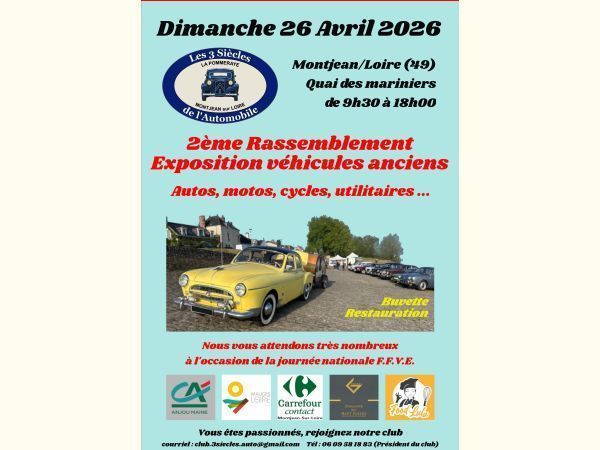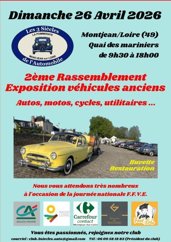 A l'occasion de la journée nationale, "les 3 siècles de l'automobile" de Montjean sur Loire - La Pommeraye, organise un rassemblement avec exposition de véhicules anciens (autos, motos, cycles, utilitaires, sportives, youngtimer ...) sur le quai des Mariniers de Montjean sur Loire, le dimanche 28 avril de 9h30 à 18h00. Passionnées, collectionneurs, visiteurs de tout âge nous vous attendons nombreux avec ou sans véhicules anciens.
