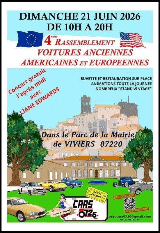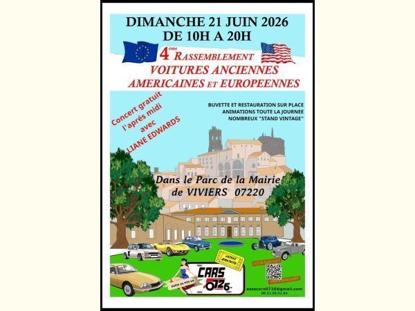 CARS0726 organise son 4eme rassemblement de voitures anciennes américaines et européennes avant 1990 et qq voitures d'exceptions ,dans le parc de la Mairie de VIVIERS 07220.