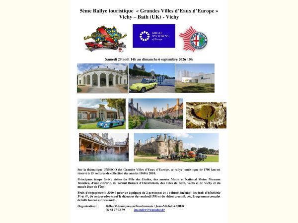 Rallye touristique réservé à 13 voitures de collection de 1960 à 2010. Samedi 29 août 14h30 au dimanche 6 septembre 10h00. 1600 km. Hébergement en hôtels 3* et 4* et traversées nocturnes de la Manche AR en ferry avec cabine par équipage. Multiples visites : Pôle des Etoiles Nancay, Musée Matra Romorantin, Ferme de Billy Calvados, Grand Bunker Ouistreham, Bath (Bains Romains,.....), National Motor Museum Beaulieu, Fougères, Musée de Jour de Fête Sainte Sévère/Indre, Vichy.