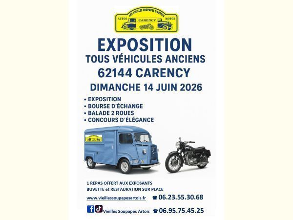 Exposition de tous véhicules anciens, avec une bourse d'échanges, une balade 2 roues (sur inscription) de 10h30 à 12h sur les routes de l'Artois ainsi qu'un concours d'élégance dans le parc de la pépinière à 14h30.