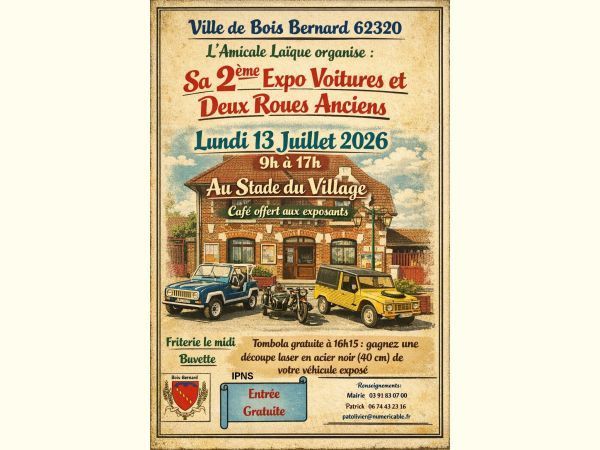Le lundi 13 juillet 2026 de 9h à 17h, lors d’un week-end festif, la ville de Bois-Bernard (62320) et sa dynamique amicale laïque organisent au stade du village, sa deuxième exposition de véhicules anciens.