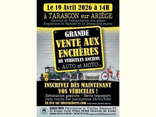 Ouvert à tous, estimation gratuite, date limite des inscriptions le 19 mars 2026 (déjà environ 140 lots). exposition le samedi et le dimanche matin. Egalement en live sur interencheres.com. Vente 11h00 pièces détachées moto et 14h00 véhicules anciens (devis transport toutes régions).