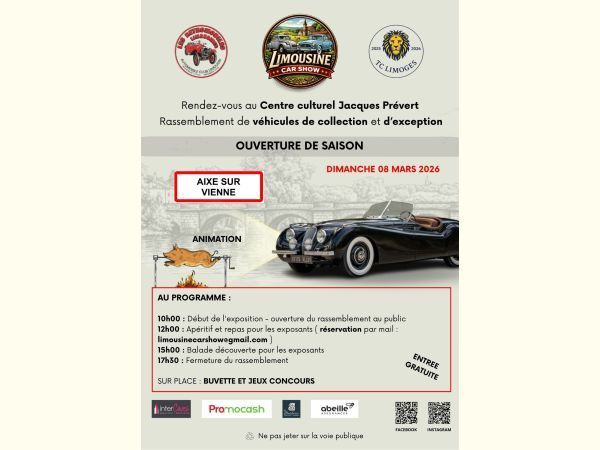 Le Limousine Car Show vous donne rendez-vous le dimanche 8 mars 2026 au Centre culturel Jacques Prévert à Aixe-sur-Vienne pour l’ouverture de saison avec un grand rassemblement de véhicules de collection et d’exception, ouvert gratuitement au public dès 10h : au programme, exposition toute la journée, animation cochon à la broche, repas prévu pour les exposants à midi (sur réservation), balade découverte dans les alentours de Aixe sur Vienne à 15h, animations, buvette et jeux concours, le tout dans une ambiance conviviale entre passionnés d’automobile, jusqu’à la fermeture du rassemblement à 17h30.
