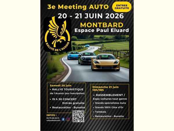 Le dimanche 21 juin toujours à l'espace Paul Eluard à Montbard : Meeting auto vous pourrez exposer vos véhicules au milieu d’une grande exposition de véhicules et d'exposants du monde de l'automobile ainsi qu'un marché d'artisans 100% Côte d'Or. En soirée, remise des Prix.