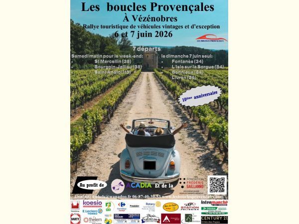 Rallye touristique à caractère caritatif au profit de la Fondation Frédéric Gaillanne, des chiens guides pour les enfants aveugles. Ouvert aux véhicules vintage et d'exception. 4 départs le dimanche : Fontanès (34), L'Isle-sur-la-Sorgue (84), Bonnieux (84) et Livron-sur-Drôme (26). Rv à 8h30 dans l'une de ces 4 villes puis départ vers 9h pour un périple en direction de Vézénobres. Rassemblement des différents itinéraires le dimanche dans la vallée de la Drôme.