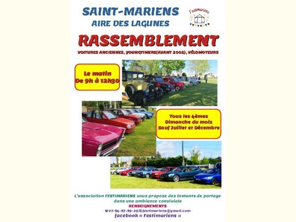 Rassemblement voitures anciennes, youngtimers (avant 2002), vélomoteurs, de 9h00 à 12h30 à St Mariens (33620, nord gironde) à l'aire des Lagunes (pour nous trouver tapez rue de la Lagune à Saint Mariens sur le GPS), en espérant que la météo soit clémente !!!