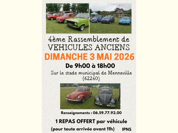 Le commitè des fetes de Menneville 62240 vous donne rendez vous le 3 mai pour son 4 ème rassemblement de vèhicules anciens ( avant 2000), lors de la brocante de la commune.