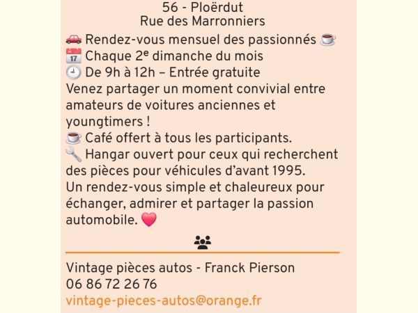 Rendez vous mensuel entre 9h et 12h tous les 2eme dimanche du mois café offert et hangar ouvert si vous recherchez de la piece ou documentation.