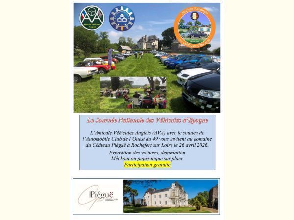 Dans le cadre de la Journée Nationale des Véhicules d’Epoque organisée par la Fédération Française des véhicules d’Epoque (FFVE), avec le soutien de l’ACO49, notre amicale vous invite à une journée « Rencontre Interclubs » au Domaine viticole du Château de Piéguë à Rochefort sur Loire, le dimanche 26 avril 2026 à partir de 10h00.