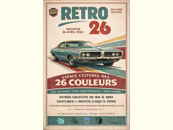 Rétro26 seconde édition : Le FéréoRétro Club est fier de vous accueillir à notre rassemblement annuel de véhicules anciens et de prestige sur l'esplanade de l'espace culturel des 26 couleurs de Saint-Fargeau-Ponthierry. Venez nombreux pour dépasser l'affluence de 2025, ses 80 véhicules et ses 600 visiteurs.