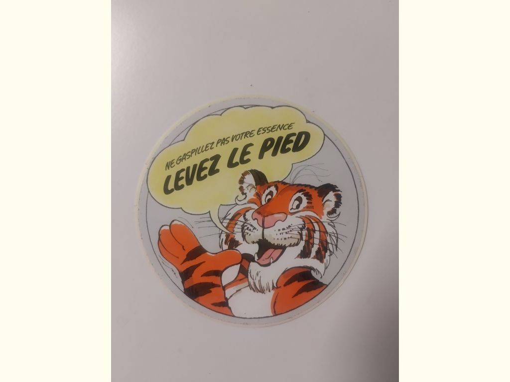 Précisions transmises par le vendeur : Autocollant authentique d'origine vintage ESSO "ne gaspillez pas votre essence, LEVEZ LE PIED" avec tigre ESSO Diamètre 12 cm.