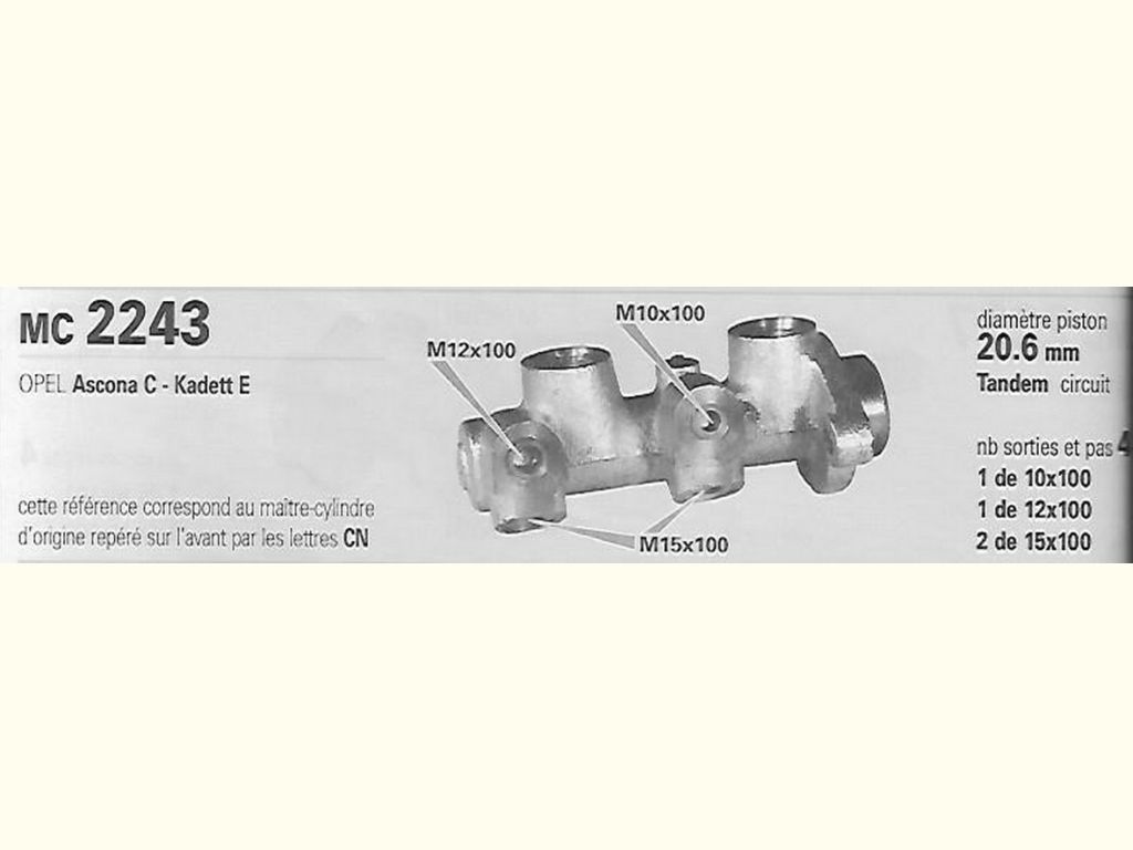 Précisions transmises par le vendeur : OPEL Ascona C 1.3/1.6/ 1.6D de 9/81 à ch E10000071, Kadett E 1.3 automatique/ 1.6D de 9/85 à ch J2592401, 1.8GSi de 8/85 à 12/87 : équivalent MGA MC2243.