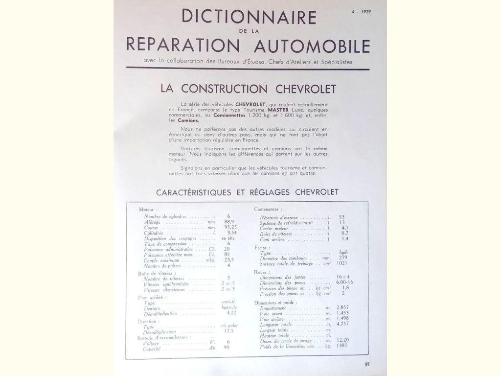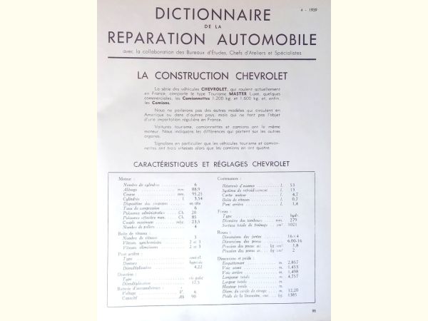 Avril 1939 - 04/1939 : sujet principal « Chevrolet tourisme et P.L» 6 cyl 3540 cc (88,9x95,25).