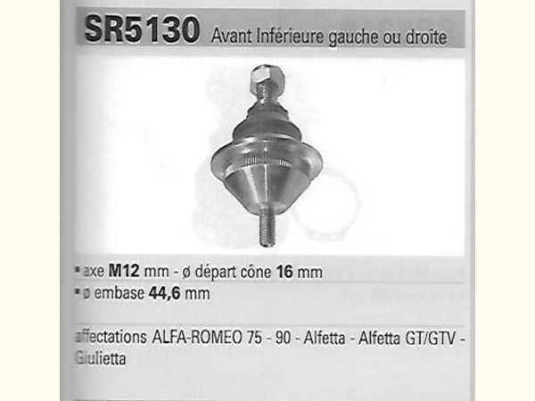 Précisions transmises par le vendeur : 75 de 11/85-2/93, 90 1,8/2,0/2,5V6 de 10/84-9/88, alfeta 1,6/1,8/2,0 de 6/72-10/86, GT/GTV 2,0/2,5V6 de 5/76-9/87, giulietta 1,3/1,6/1,8/2,0 de 7/77-6/86 : inférieure gauche/droite équivalent MGA SR5130.