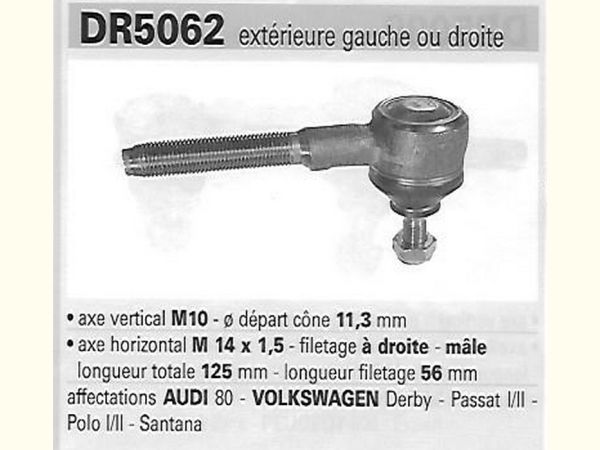 Marque de la pièce : LOCKHEED Référence de la pièce : EB1054 Type de la pièce : Extérieure G ou D suivant modèle equivalent MGA DR5062 Nombre d'exemplaires : 1 Catégorie : Rotule de Direction