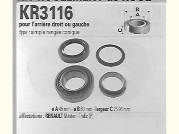 Précisions transmises par le vendeur : Master tous modèles propulsion avec tambour moyeu, de 9/80 à 9/97, Trafic chassis + cabine, de 1/84 à 4/01 avec tambour moyeu. Roulement 45x80x25,96 : Gauche et droite équivalent MGA KR3116.