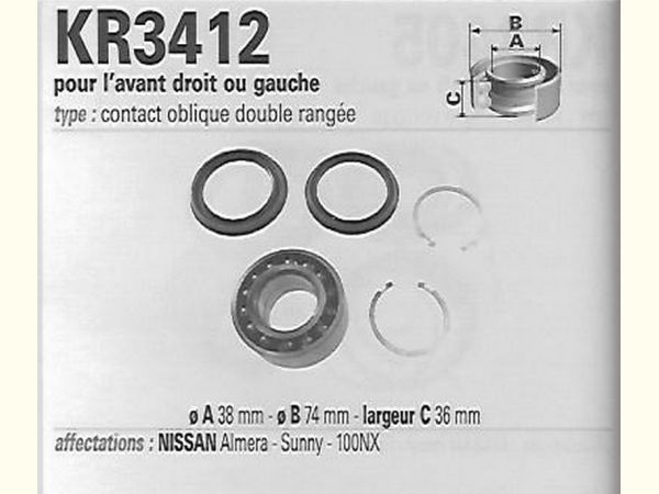 Précisions transmises par le vendeur : Almera tous modèles (N15) de 10/95 à 6/00, Sunny tous modèles de 1/91 à 2/96, 100NX tous modèles de 1/91 à 1/97, roulement 38x74x36 : Gauche et droite équivalent MGA KR3412.