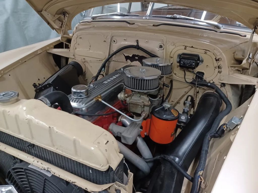 Il est équipé d'une boîte manuelle à trois vitesses avec surcharge électrique, d'un six cylindres de 235 chevaux, d'un échappement double et de deux carburateurs. Les roues chromées sont récemment remplacées et il est équipé de pneus blancs larges neufs. La verre et le chrome sont en excellent état.