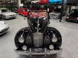 La voiture est peinte dans une combinaison de couleurs éclatante avec un noir brillant et un intérieur en cuir rouge, accompagné d'une capote vinyle beige