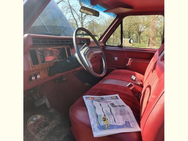 Configuration rare et dans un état très sain, ce pick-up représente à lui seul l'esprit américain des années 80 : ligne robuste, teinte bi-ton noire et grise soulignée d'une bande rouge d'origine, intérieur rouge en tissu d’époque, et un bon gros V8 sous le capot.