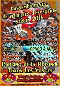 Rassemblements Mensuels de Véhicules d'Exception Toutes Marques, Anciens, Très Anciens, Collection, Sportifs et Contemporains d'Exception / Prestige. Thème : tout véhicules anciens et récents : voitures, motos, camions, solex, etc... Café offert aux exposants et aux visiteurs. (sous couvert en cas de pluie). Contacts AT2A88 : Forum: http://at2a88.forumactif.org/. Facebook : https://www.facebook.com/at2a88?fref=ts. Tous les deuxièmes dimanche du mois, de 10h00 à 12h00, d'Avril à Octobre, sauf celui d'Août sur la journée complète de 9h à 18h. Les visiteurs et curieux sont les bienvenus : entrée libre et gratuite.