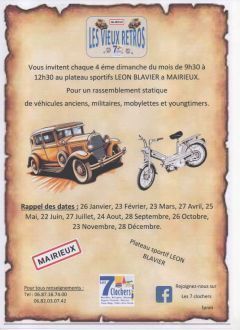 Tous les 4e dimanche du mois, rassemblement de véhicules anciens de minimum 30 ans (1994), voitures, camions (tracteur solo) véhicules 2 roues, tracteurs agricoles.
