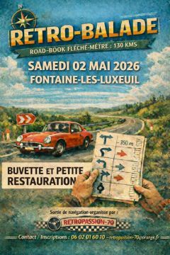 Balade touristique dénommée « Rétro balade Saônoise », le samedi 02 Mai 2026, au départ de Fontaine les Luxeuil. Cette manifestation a pour but de vous faire découvrir, des paysages et villages atypiques, le tout dans une ambiance de franche camaraderie, au volant de votre véhicule. La randonnée est réservée à des véhicules, 1ère immatriculation avant le 31 décembre 1996. (Plus de 30 ans) Un classement sera effectué tout le long du parcours par le biais de balises, jeux, questions, photos, simples et ludiques, un bonus sera appliqué suivant l’année des véhicules. Vous suivrez le parcours prévu grâce au carnet d’itinéraire (roadbook) qui vous sera remis au départ de chaque étape. Les départs seront donnés de manière échelonnée et les participants circuleront non groupés dans le respect du Code de la Route et sans entrave à la circulation. La manifestation sera constituée par un parcours total d’environ 130 kms. 50 le matin 80 l’après-midi
