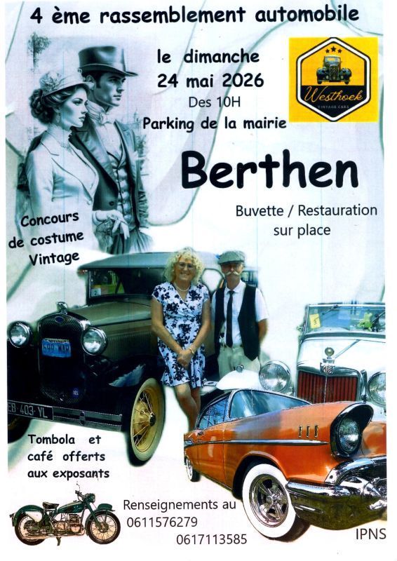 L e dimanche 24 mai 2026 se tiendra notre 4éme rassemblement automobile sur le parking de la mairie de Berthen. Sont acceptés les véhicules de plus de 25 ans, les véhicules d'exception, youngtimers, motos, tracteurs...