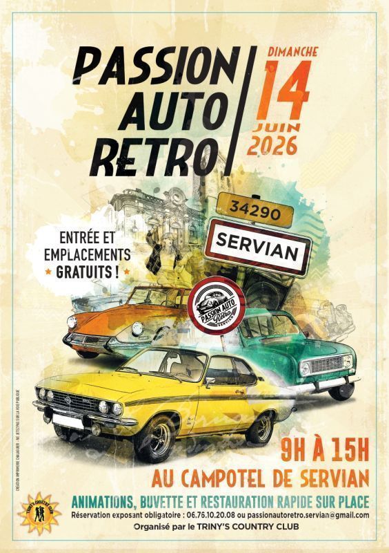 Le PARS (Passion Auto Rétro Servian) organise son 4e rassemblement de voitures anciennes sur l’aire du campotel de Servian le 14 juin 2026, de 9h00 à 15h00. Une restauration rapide (hot-dogs, croque-monsieur, frites et crêpes + boissons…) sera disponible à l’ombre des pins et avec tables et chaises.