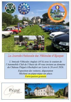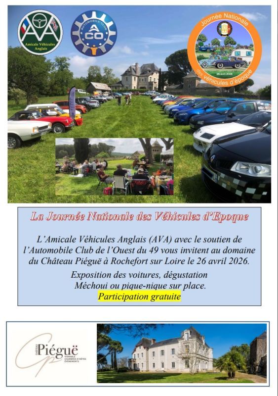 Dans le cadre de la Journée Nationale des Véhicules d’Epoque organisée par la Fédération Française des véhicules d’Epoque (FFVE), avec le soutien de l’ACO49, notre amicale vous invite à une journée « Rencontre Interclubs » au Domaine viticole du Château de Piéguë à Rochefort sur Loire, le dimanche 26 avril 2026 à partir de 10h00.